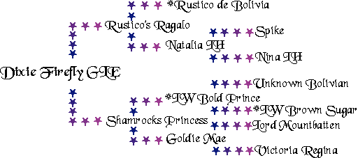 Dixie is the first offspring of Ragalo. Dixie has placed in the showring and has been sheared annually since she was a yearling. Dixie yields 2 pounds of skirted fleece off of her body or barrel area. She has a curious and mischevious personality topped by a curly suri-like 24.8 micron fleece both of which she inherited from her sire. Dixie's fiber won Second place (Jordan won first place) out of 21 entries in the fiber competition at the 1996 Autumn Classic.